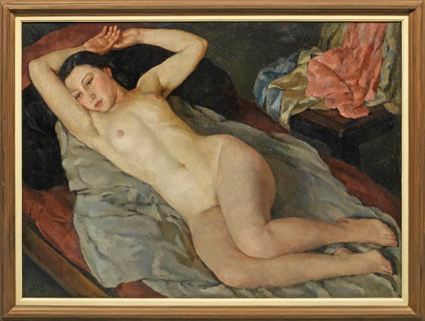 Das mit weich-pastosem Duktus gemalte Werk verbindet - wie es in der Malerei der 1930er Jahre häufig ist - realistische und impressionistische Stilelemente. Dies wird besonders in den Textilien des Lakens und der auf dem Stuhl liegenden Kleider sichtbar, während die in Aufsicht geschilderte Figur gleichsam plastisch modelliert wird. Durch die Diagonalkomposition und die angewinkelten Beine erhält das Gemälde die nötige Spannung. Den Schwerpunkt im Oeuvre des argentinischen Malers Francisco Vidal bilden weibliche Akte und Bildnisse junger Frauen. Vidal studierte an der Akademie in Córdoba und erhielt 1924 ein Europa-Stipendium, das es ihm ermöglichte seine künstlerische Ausbildung bis 1928 in Madrid, Frankreich und Italien fortzusetzen. 1931-1950 war Vidal Direktor der Akademie in Córdoba. Im Laufe seiner künstlerischen Karriere gewann er zahlreiche nationale und internationale Preise, darunter Auszeichnungen in Madrid und in den USA sowie eine Goldmedaille auf der Weltausstellung in Paris 1937. Öl/Lwd.; L. u. sign. u. dat. (1)933. 79,5 cm x 109,5 cm. Rahmen.
