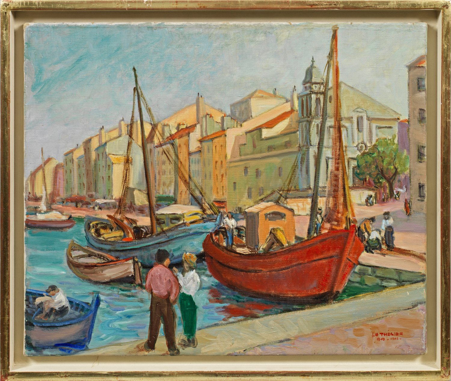 In kräftiger, sommerlicher Farbigkeit und kraftvollem, dynamischem Duktus gemalte Hafenansicht der südfranzösischen, an der Mittelmeerküste gelegenen Hafenstadt. Im Hafenbecken liegen die Fischerboote, die Promenade wird von arbeitenden Fischern belebt und eine pittoreske Häuserzeile mit kleiner Kirche führt den Blick des Betrachters in die Tiefe. Öl/Lwd.; R. u. sign. und dat. 1948 - 1962. Verso nochmals sign., bez. und betitelt sowie versehen mit Etikett. 50 cm x 61 cm. Rahmen.
