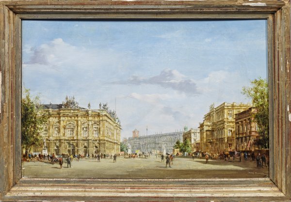 Die nostalgische Vedute zeigt die vielfigurig belebte Prachtstraße Unter den Linden in der Wilhelminischen Zeit vor dem I. Weltkrieg mit Kutschen und ersten Automobilen. Zarttonig und mit fein nuanciertem Duktus gemaltes Werk Pallmanns, der neben Berlin-Ansichten auch viele Veduten europäischer Metropolen schuf. An diesen faszinierten ihn das Licht, die Atmosphäre und das mondäne Leben. Öl/Hartfaser. R. u. sign.; 45 cm x 70 cm. Rahmen.