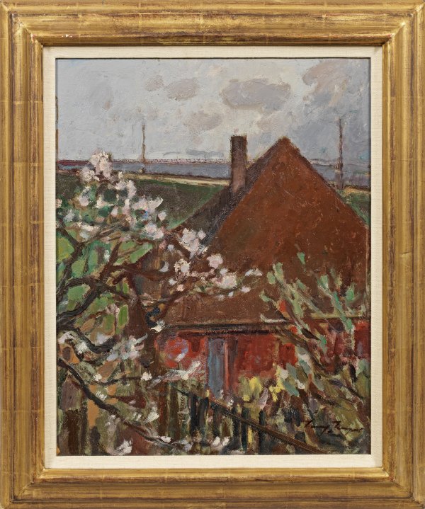 In kraftvollem Duktus gemalte, ausschnitthaft komponierte Ansicht über blühende Bäume und Dächer auf die Elbe bei Stade. Wagner, der 1951 - 1958 Schüler der Bildhauerei bei Fritz Behn in München war, fand über die Zeichnung zur Malerei, in der er sich autodidaktisch weiterbildete. Bereits 1953 erfolgten Ankäufe renommierter Sammlungen wie dem Lenbachhaus, der Neuen Pinakothek München und der Sammlung Georg Schäfer. Geprägt durch sein reges, vielschichtiges Interesse - im Bereich der Musik, der Literatur, der Philosophie, der Geschichte und auch der Kunstgeschichte - sowie seine ungebremste Schaffenskraft schuf er ein ausgesprochen umfangreiches Oeuvre. 1988 wurde Wagner der "Preis der Musen" verliehen, ausgeschrieben von der Akademie in Florenz, wodurch er Ehrenmitglied jener bedeutenden Kunstakademie wurde. Öl/Masonitplatte. R. u. sign. Verso auf einem Etikett, betitelt und datiert 1980. 50 cm x 39,5 cm. Rahmen.