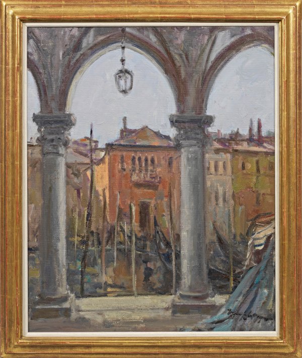 In erdigem Kolorit und lockerem Duktus festgehaltener Blick durch die Arkadenbögen des berühmten Venezianischen Fischmarktes auf den von Gondeln zahlreich frequentierten Kanal und die Häuserfassaden des gegenüberliegenden Ufers. Wagner, der 1951 - 1958 Schüler der Bildhauerei bei Fritz Behn in München war, fand über die Zeichnung zur Malerei, in der er sich autodidaktisch weiterbildete. Bereits 1953 erfolgten Ankäufe renommierter Sammlungen wie dem Lenbachhaus, der Neuen Pinakothek München und der Sammlung Georg Schäfer. Geprägt durch sein reges, vielschichtiges Interesse - im Bereich der Musik, der Literatur, der Philosophie, der Geschichte und auch der Kunstgeschichte - sowie seine ungebremste Schaffenskraft schuf er ein ausgesprochen umfangreiches Oeuvre. 1988 wurde Wagner der "Preis der Musen" verliehen, ausgeschrieben von der Akademie in Florenz, wodurch er Ehrenmitglied jener bedeutenden Kunstakademie wurde.