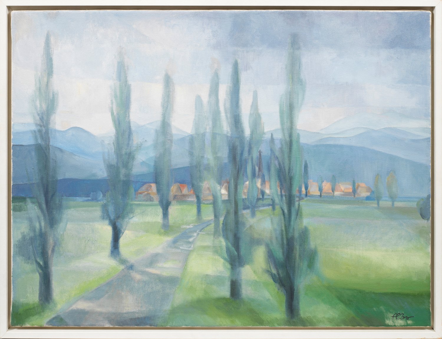 In reduzierter Formensprache, prismenartiger Lichtführung und lasierendem, geschichtetem Farbauftrag angelegte Landschaft, die charakteristisch für das Oeuvre der Künstlerin ist. Alber studierte an der Stuttgarter Akademie bei Willi Baumeister und Ernst Fuchs und arbeitete 1952 - 1971 in den USA, wo sie sich detailliert mit dem Abstrakten aber auch den Malern des amerikanischen Realismus auseinandersetzte. Den größten Einfluss auf ihr Schaffen übernahm jedoch der Kubismus und die prismatische Bildstruktur Lyonel Feiningers. Seit ihrer Rückkehr nach Deutschland ist sie als freischaffenden Künstlerin tätig, seit 2002 in Berlin. Öl/Lwd.; R. u. sign.; Verso auf Galerieetikett bez. und betitelt. 60 cm x 81 cm. Rahmen.
