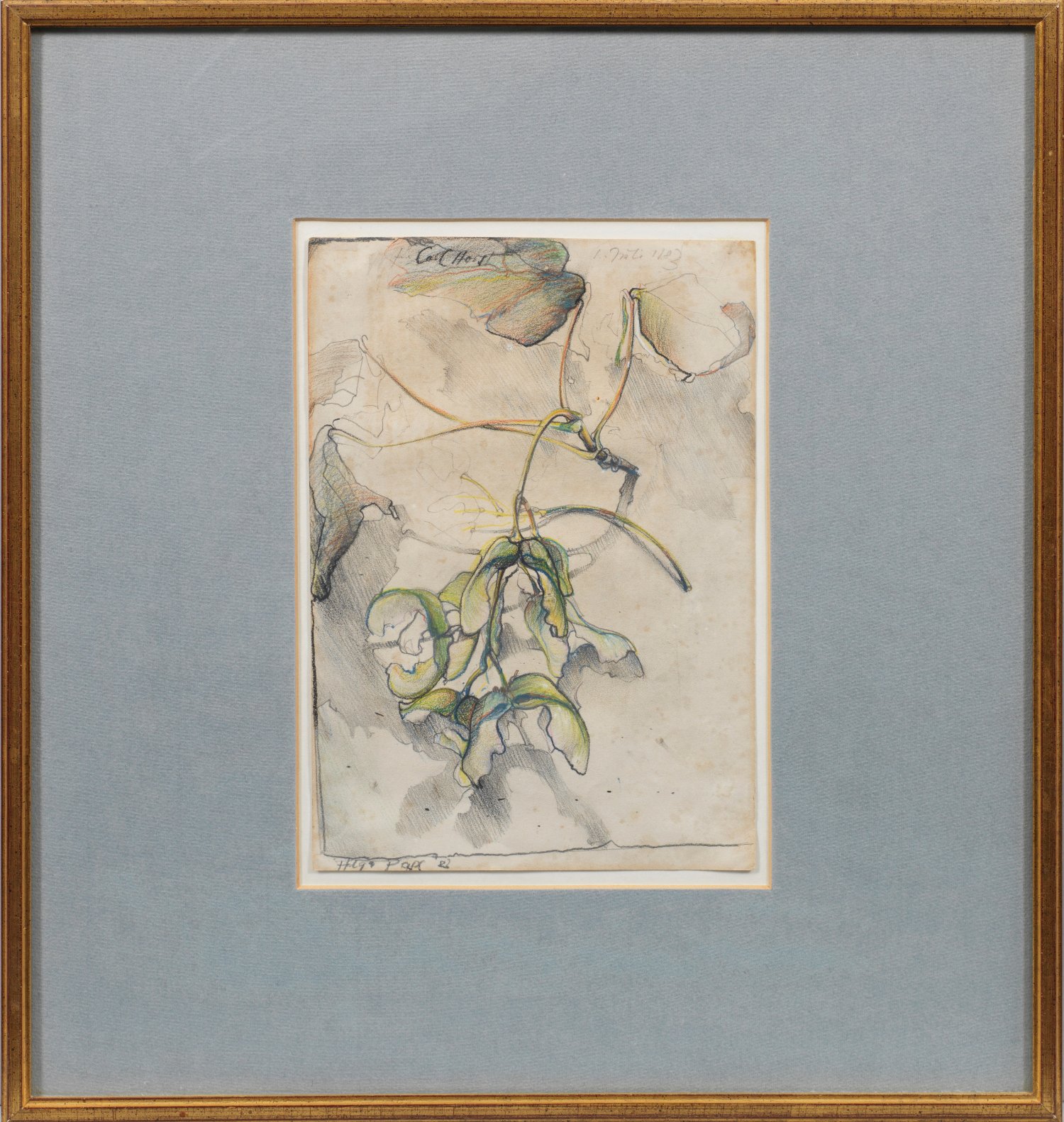 Künstlerisch virtuos ausgeführtes, schönes Stillleben Janssens, einem der bedeutendsten deutschen Maler, Zeichner und Grafiker in der Kunstgeschichte. Außer Porträts, Figuren und Landschaften hielt er oft Stillleben fest - als Motive vornehmlich einfache, unprätentiös arrangierte Sträuße, aber auch Zweige, Blumen und Früchte, die ihn spontan reizten. Mischtechnik/altes Papier. L. u. bez. u. dat. "Helga Pape (19)83", oberhalb "Carl Horst 1. Juli 1983." Ca. 24,5 cm x 17,5 cm. Rahmen.