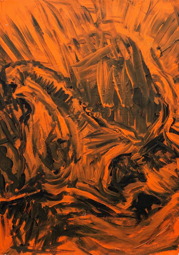 Auf Schwarz und Orange reduzierte, gestisch angelegte, stark pastose Komposition des dänischen Künstlers, der sich autodidaktisch bildete. Ausgehend von der amerikanischen Konzeptkunst experimentierte Wörsel stets mit verschiedenen Malmethoden und Stilen und entwickelte somit seine Bildsprache kontinuierlich weiter. 1983-1985 reduzierte er seine Farbpalette auf Schwarz, Grau und Orange, wofür das vorliegende Werk ein treffendes Beispiel bildet. Ab 1969 wurden seine Werke auf zahlreichen Gruppen- und Einzelausstellungen gezeigt. 2007 gestaltete er den Dänischen Pavillon auf der 52. Biennale in Venedig. Acryl/leichtem Karton, kaschiert auf Lwd.; Verso sign. und dat. 1983. Ca. 71 cm x 51 cm.