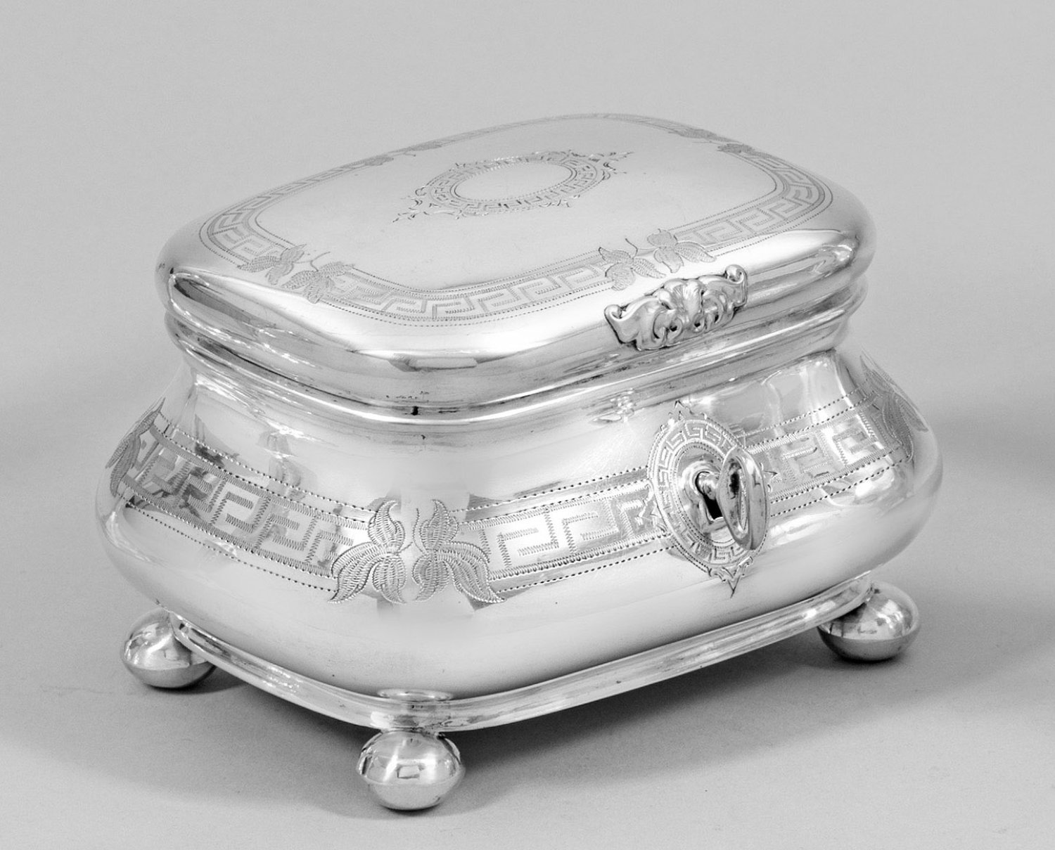 Silber. Über vier Kugelfüßen, rechteckiger, stark gebauchter Korpus mit gerundeten Ecken und Kanten. Gering gewölbter Scharnierdeckel mit volutiertem Drücker. Schauseitiges Schloss mit Schlüssel. Wandung, Schlüsselloch und Deckel verziert mit umlaufenden Mäanderbändern, gegliedert von Blättern. Innen vergoldet. Gest. 750. Gew. ca. 270 g. H. 9 cm. 13 cm x 11,5 cm.