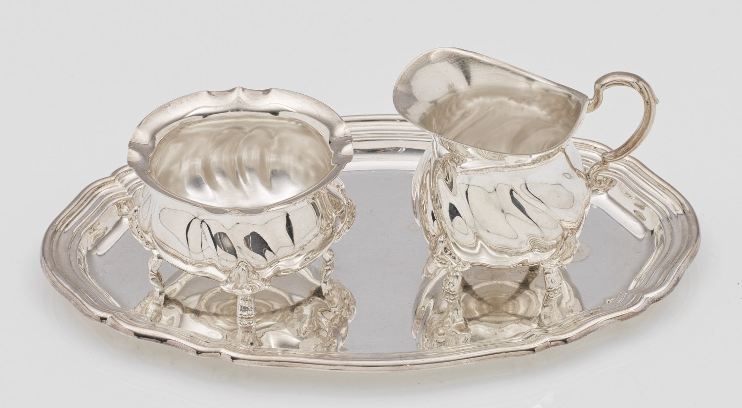 Sterlingsilber. 3-tlg.; Sahnegießer, Zuckerschale und Tablett. Gedrückt bauchiger, von geschwungenen Zügen gegliederter Korpus über stilisierten Tatzenfüßen, am Ansatz mit Rocaillen verziert. Blütenförmig geschweiftes, ovales Tablett mit mehrfach profiliertem Rand. Gest. 925, Herstellerzeichen, Händlermarke. Gew. zus. ca. 265 g. H. 5 cm - 7,3 cm. Tablett: 21,5 cm x 14,3 cm.