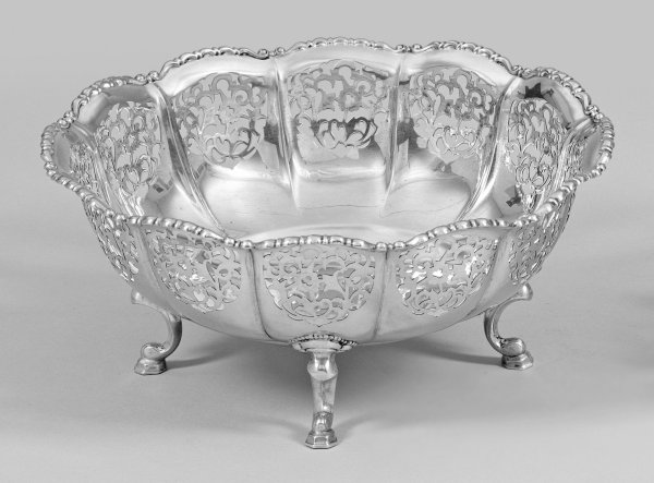 Silber. Über vier Füßen in Form von stilisierten Hufen ausschwingende, glatte Schale. Wandung zwölffach durch gekniffene Züge blütenförmig gegliedert sowie obere Wandungshälfte floral durchbrochen gearbeitet. Gering ausgestellter, passig geschweifter und profilierter Rand. Gest. 800, Herstellerzeichen. Gew. ca. 600 g. H. 11,3 cm. D. 25 cm.