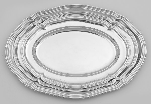 Silber. Ovale Form. Gering gemuldeter, glatter Spiegel, übergehend in breite, blütenförmig geschweifte Fahne mit mehrfach profiliertem Rand. Gest. 835, 800, Herstellerzeichen. Gew. zus. ca. 2710 g. 40 cm x 27,5 cm bzw. 35 cm x 51 cm.
