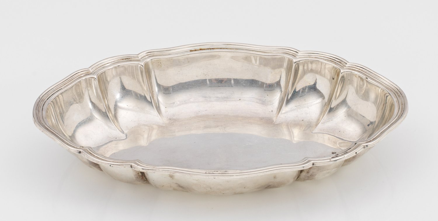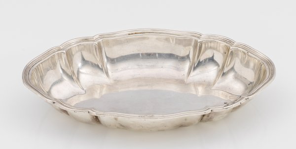 Silber. Ovale Form. Vertiefter, glatter Spiegel, übergehend in aufsteigende, blütenförmig geschweifte Fahne mit mehrfach profiliertem, ausgestelltem Rand. Gest. 830, Herstellerzeichen. Gew. ca. 465 g. H. 5 cm. 31 cm x 21 cm.