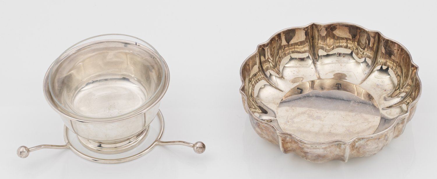Silber und Sterlingsilber. Kleine runde Aufsatzschale und passig geschweifte Schale, dazu ein Glaseinsatz. Gest. 800, Sterling, unterschiedliche Herstellerzeichen. Minim. best.; Gew. zus. ca. 330 g. H. 6,5 cm - 4,5 cm. D. 12 cm - 17 cm.