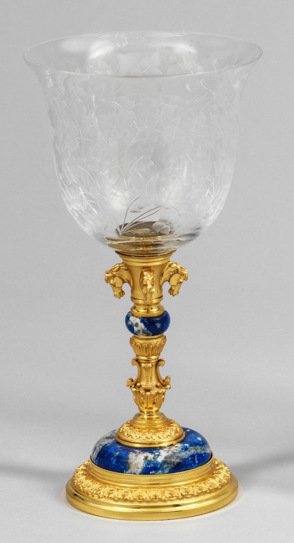 Silber, vergoldet, farbloses Kristallglas mit Schnittdekor und Lapislazuli. Über mehrfach getrepptem, von reliefiertem Eierstabfries umzogenem Rundstand ein kurzer Balusterschaft. Nodus und Schaftansatz aus geschliffenem Lapislazuli. Glockenförmig ausschwingende Glaskuppa mit üppigen Blattranken verziert, getragen von vier vollplastisch ausgestellten Pferdeköpfen. Gest. 800, Beschauzeichen mit Herstellernr. "1125". H. 24,5 cm. Kuppa-D. 12,8 cm.
