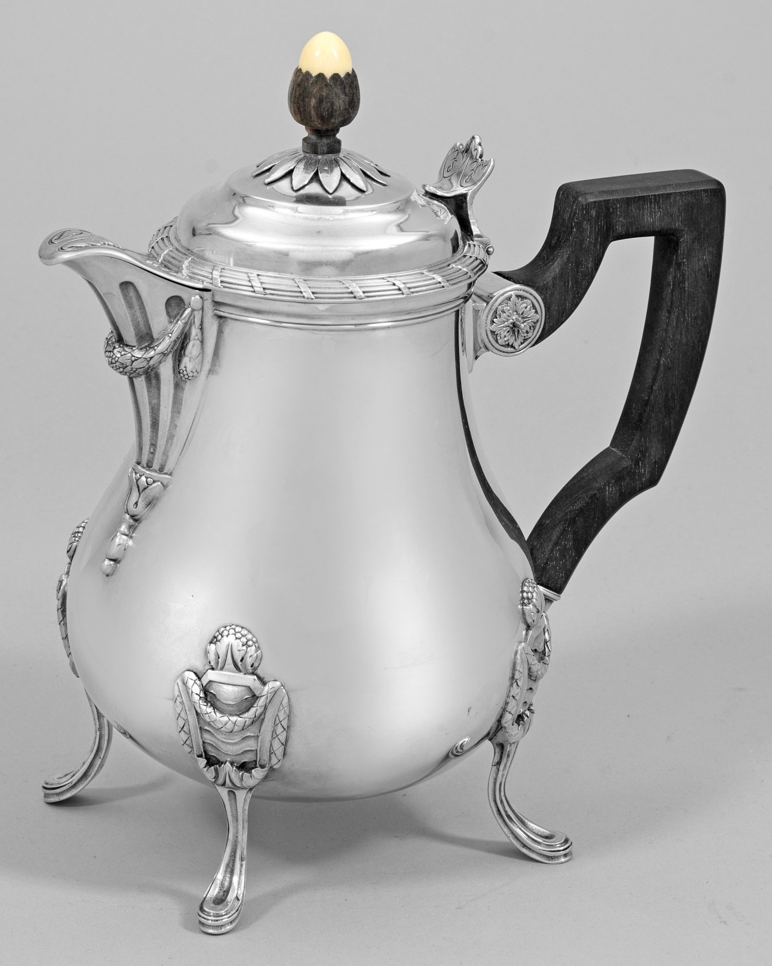 Silber. Drei ausgestellte, schmale, am Ansatz mit Festons und Blütenknospen verzierte Füße, übergehend in glatten, birnförmig gebauchten Korpus. Tief angesetzter mit Blütenkelch verzierter Konsolausguss, von Kanneluren gegliedert und mit Lorbeerblattfeston geschmückt. Aufgewölbter, von profiliertem Zierband umzogener, scharnierter Deckel mit blattverzierter Ausgussabdeckung. Zentral über blütenförmiger Rosette eine stilisierte Eichel aus Ebenholz und Elfenbein als Knauf. Passig geschweifte, ziselierte Daumenrast. Gekanteter Henkel aus Ebenholz, am Ansatz von Blattrosetten gefasst und in konischer Tülle mit graviertem Lanzettblatt endend. Gest., Beschauzeichen, Herstellerzeichen. Gew. ca. 960 g. H. 23,5 cm.