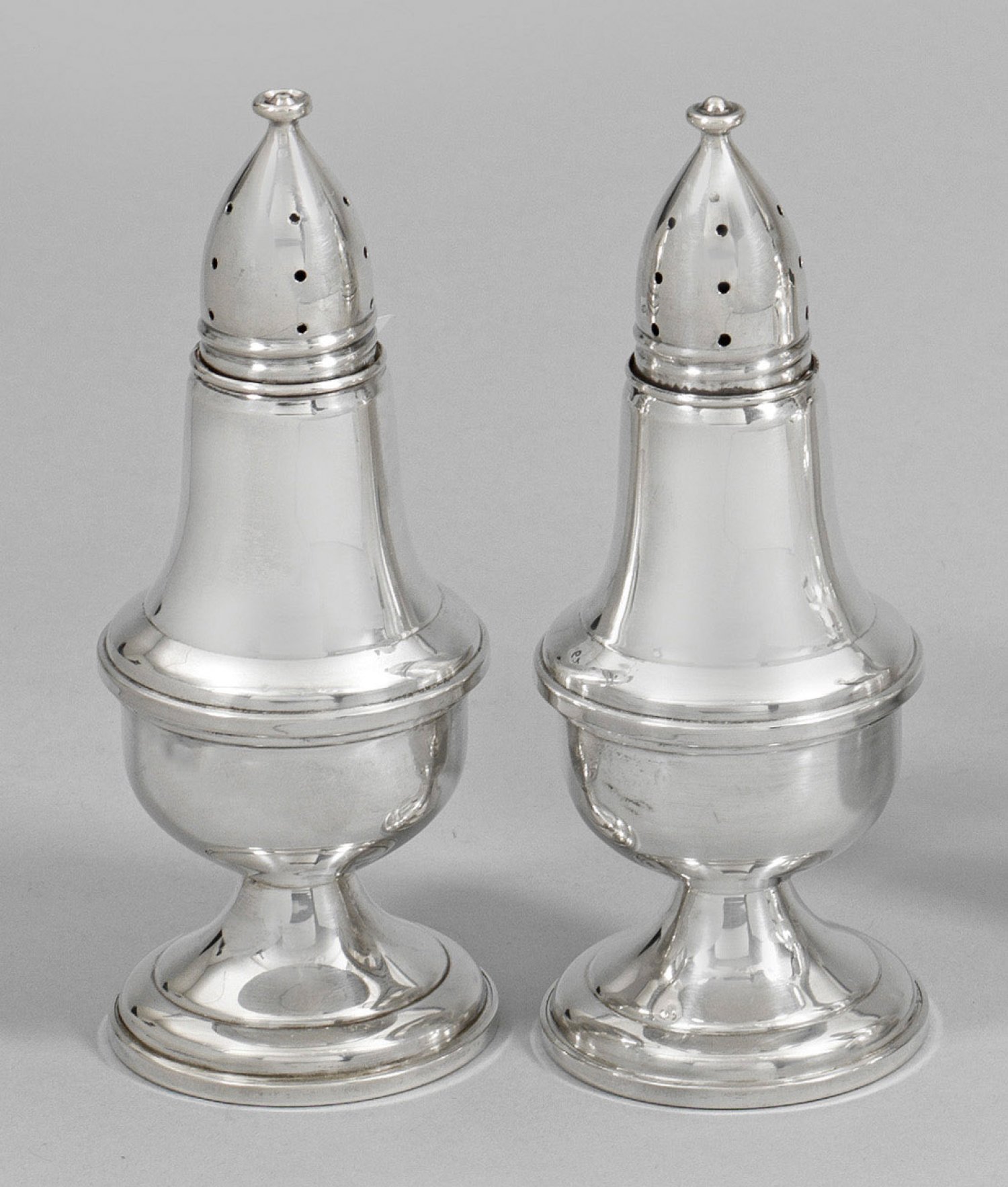 A pair of German silver weighted salt and pepper shakers with glass insert. Standard mark Sterling.