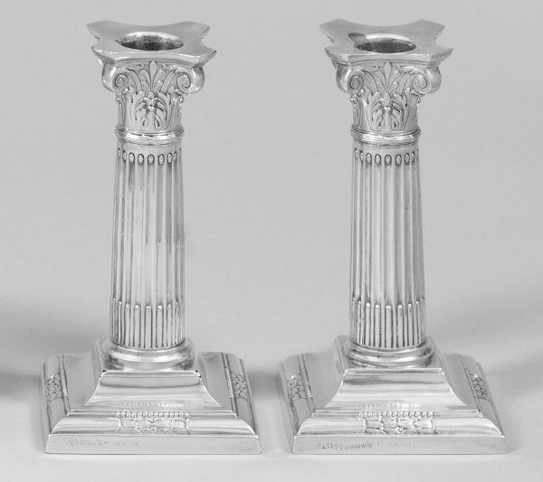 Silber. Quadratische, profilierte Plinthe mit Blütenkelchdekor umzogen. Kannelierter Schaft in Form einer korinthischen Säule, übergehend in reliefiertes Akanthuskapitell mit Kreuzbanddekor. Vierpassig eingezogene, flache Traufschale. Gest. 800, Herstellerzeichen, Händlermarke "F. Apell, Erfurt". Gew. zus. ca. 265 g. H. 15,5 cm.