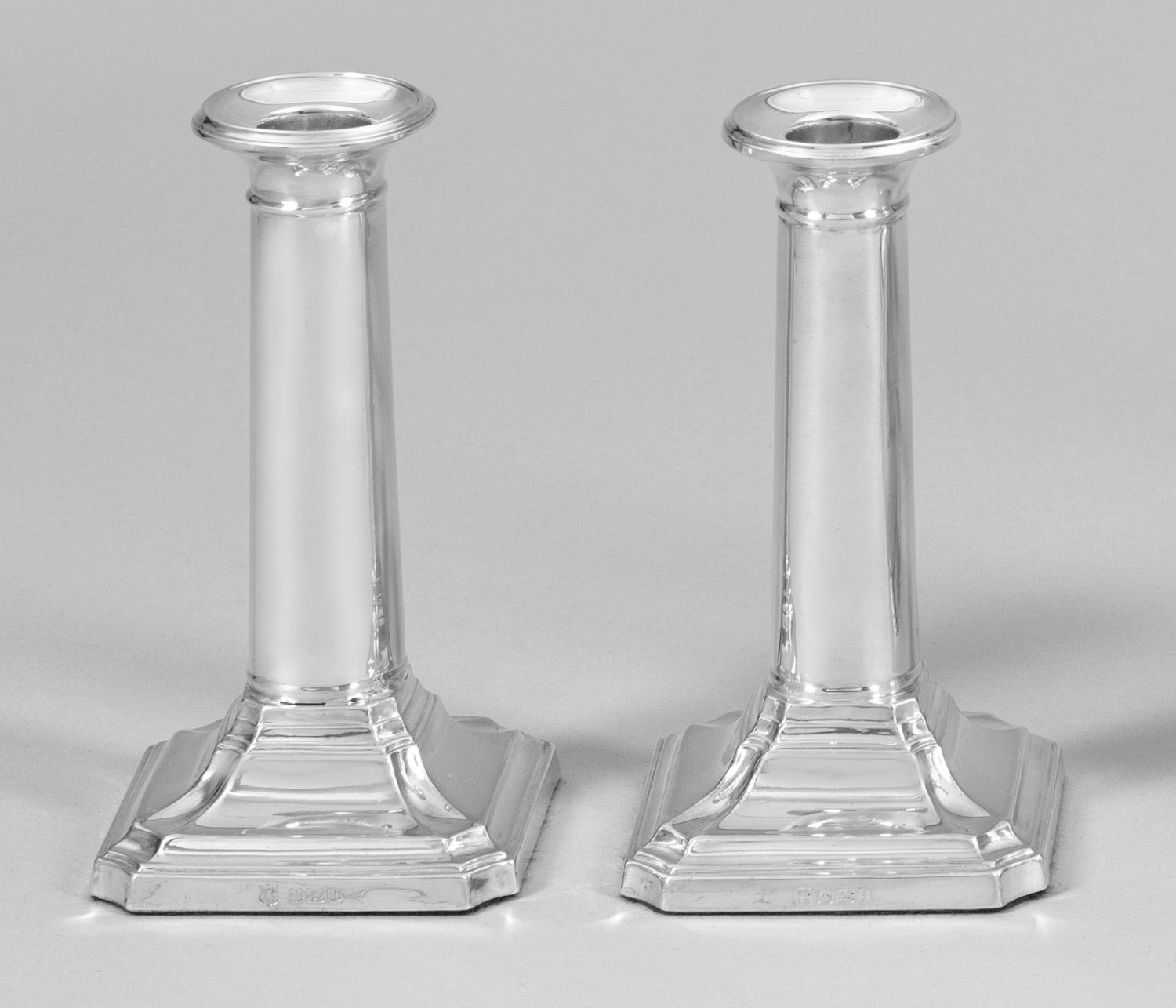 Sterlingsilber. Quadratischer, mehrfach profilierter Stand mit eingezogenen Ecken, beschwert. Säulenförmig zylindrischer, glatter Schaft in sich erweiternder Traufschale endend. Gest., Beschaumarken, Herstellerzeichen, Jahresbuchstaben "z" und "t". Gew. zus. ca. 435 g. H. 13,5 cm.