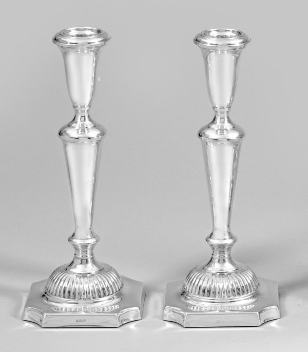 Sterlingsilber. Quadratischer Stand mit eingezogenen Ecken, beschwert. Über godroniertem, rundem Ansatz konischer Schaft mit abgesetzter Schulter. Vasenförmige Tülle. Gest. Sterling. Gew. zus. ca. 985 g. H. 22,5 cm.