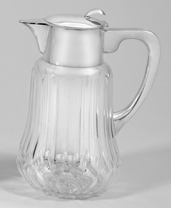 sog. Kalte Ente. Farbloses Kristallglas mit Montierung aus Sterlingsilber. Bauchiger, mittig eingezogener, hoher Korpus, vertikal gegliedert von breitem, facettiertem Schliffdekor. Glatte Montierung, übergehend in Konsolausguss, gekanteten Henkel und scharnierten, flachen Deckel mit gebogter Daumenrast. Zylindrischer Glaseinsatz für Eiswürfel. Gest. 925, Herstellerzeichen. H. 29,5 cm.