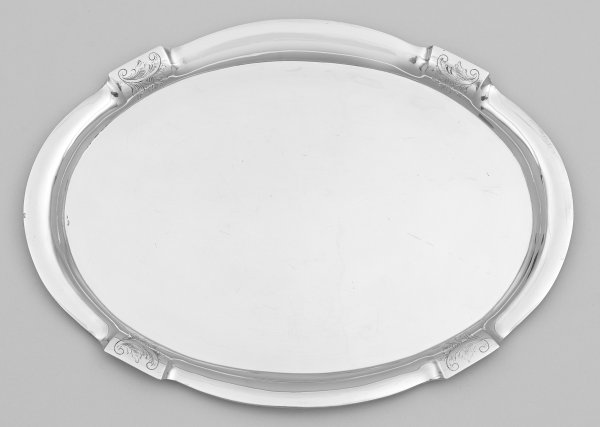 Silber. Ovale Form. Glatter Spiegel, übergehend in gewölbt ausgestellte Fahne, vierfach gegliedert durch gekantete Kartuschen, verziert mit gravierten Blattvoluten. Gest. 835, Niederländische Repunzierung, unbekanntes Herstellerzeichen "DA". Gew. ca. 615 g. 38 cm x 28 cm.