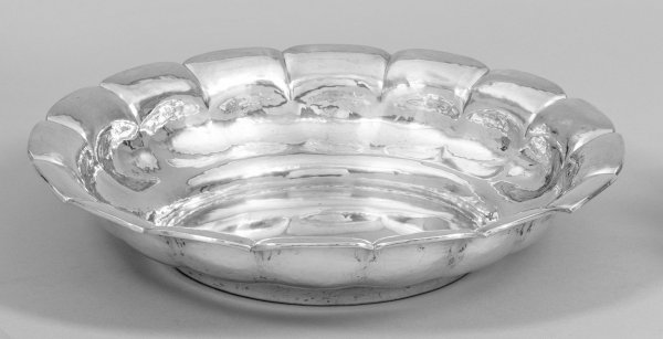 Silber. Runde, sich stufenartig erweiternde Schale mit blütenförmigem, ausgestelltem Rand. Wandung gegliedert durch zart angedeutete Buckel und umlaufend verziert mit Hammerschlagdekor. Gest. 800, Herstellerzeichen. Gew. ca. 350 g. H. 5,3 cm. D. 27,3 cm.
