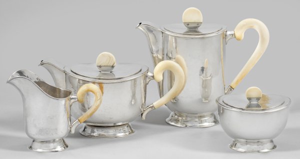 Silber und Elfenbein. 4-tlg.; Kaffee- und Teekanne, Sahnegießer sowie Zuckerdose. Ovaler, gekehlter und ausgestellter Stand, übergehend in hohen, zylindrischen Korpus mit flachem, leicht nach innen gebogtem Scharnierdeckel. Tief angesetzter, gering aufsteigender Konsolausguss mit passig geschweifter Abdeckung. Gebogter Ohrenhenkel und halbkreisförmiger, genieteter Scheibenknauf aus Elfenbein. Wandung flächendeckend, äußerst fein martelliert. Modell-Nr. "5703". Gest. 800, Herstellerzeichen. Gew. zus. ca. 1865 g. H. 10,5 cm - 21,5 cm.