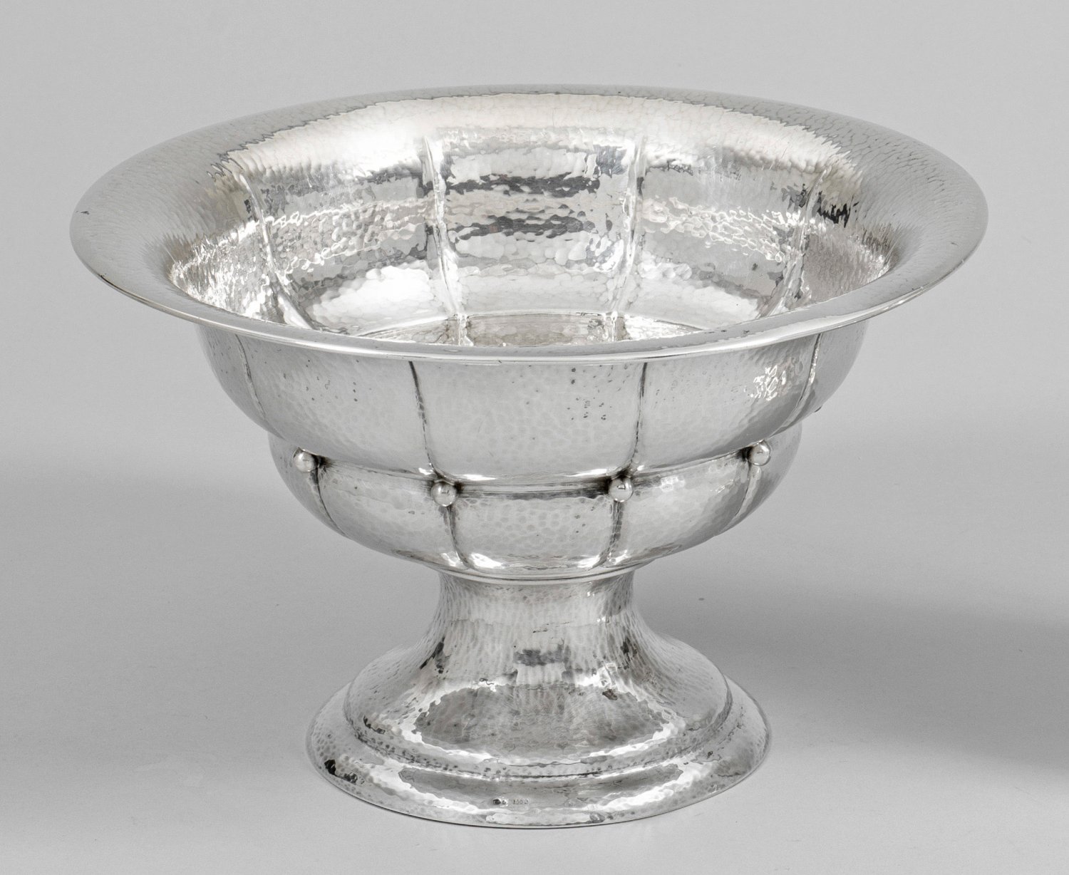 Silber. Trompetenförmiger Stand. Durch horizontale Kehlung gebauchte, sich zum Rand hin erweiternde und durch vertikale Züge gegliederte Schale mit appliziertem Kugeldekor. Wandung flächendeckend mit feinem Hammerschlagdekor verziert. Gest. 830, Beschauzeichen. Gew. ca. 560 g. H. 16,5 cm. D. 27 cm.