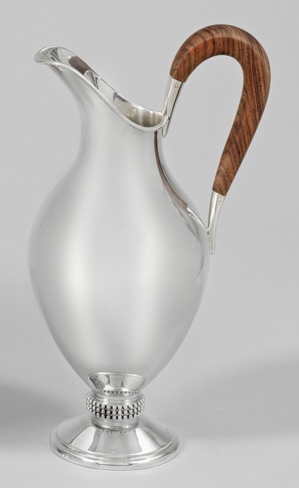 Sterlingsilber. Runder, profilierter Stand, übergehend in kurzen Schaft, dreireihig umzogen von reliefplastischen Perlbändern. Ovoider, glatter Korpus mit schlankem, zum Ausguss geweiteten Hals. Hochgezogener Ohrenhenkel aus fein gemasertem Holz. Gest. 925, Herstellerzeichen. Gew. ca. 635 g. H. 28 cm.