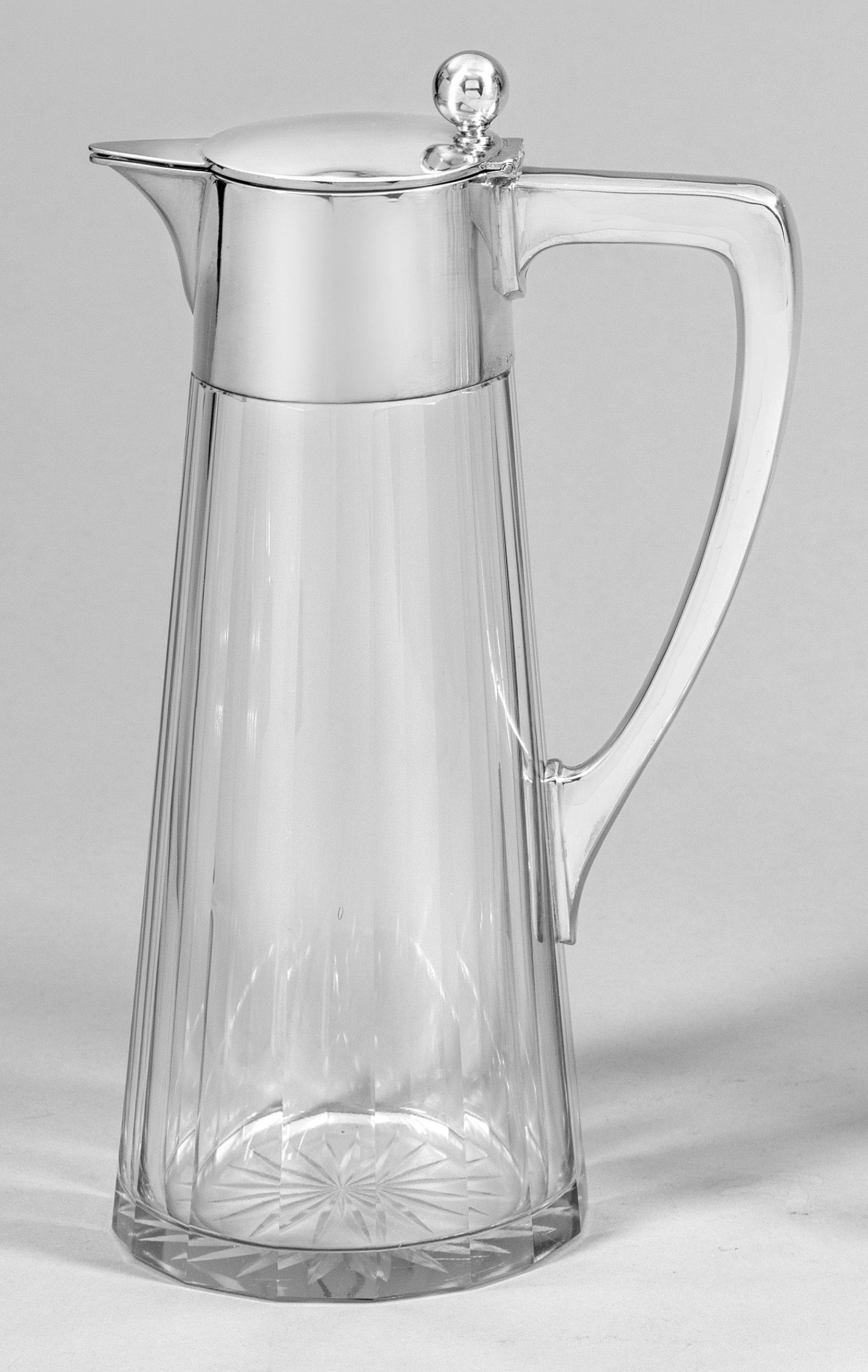Farbloses Kristallglas mit Silbermontierung. Konischer, umlaufend facettierter Korpus. Glatte Montierung mit flachem Deckel, kugelförmiger Daumenrast und gekantetem Henkel. Gest. 835, Herstellerzeichen. H. 27,5 cm.