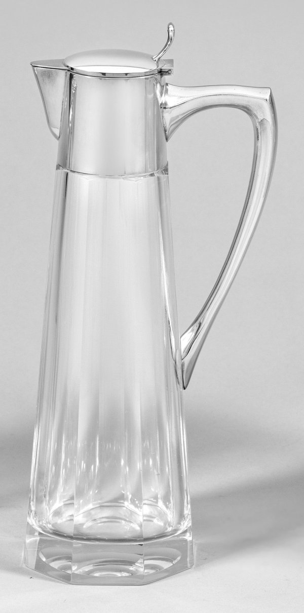 Farbloses Kristallglas mit Montierung aus Sterlingsilber. Konischer, umlaufend facettierter Korpus. Glatte Montierung mit Konsolausguss, flachem Deckel, gebogter Daumenrast und gekantetem Henkel. Gest. 925. H. 31 cm.