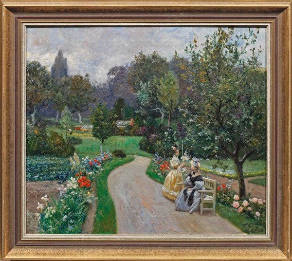 Sommerlich erblühte, heitere Parkansicht des ab 1876 an der Düsseldorfer Akademie ausgebildeten, vielseitigen Malers, der besonders für seine impressionistisch angelegten Darstellungen von Gesellschaftsszenen und Interieurs Bekanntheit erlangte. Öl/Lwd. R. u. sign.; 49 cm x 58 cm. Rahmen.