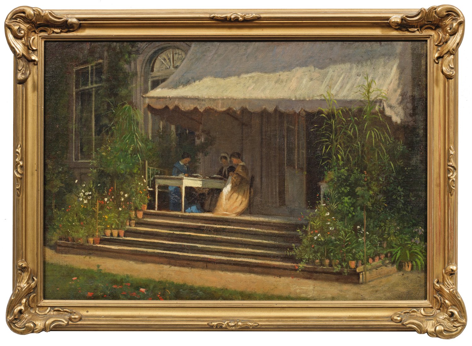 In gekonnter Lichtführung inszenierte, heitere Szene mit drei Damen, die vertieft in ihre Handarbeiten, zusammen auf einer mit Topfpflanzen umrahmten Terrasse, unter einer Schatten spendenden Markise sitzen. Öl/Lwd.; Verso unleserl. bez. sowie mit Papieretikett des Kunstverlags F. Sala & Co. in Berlin. 34 cm x 50 cm. Rahmen.