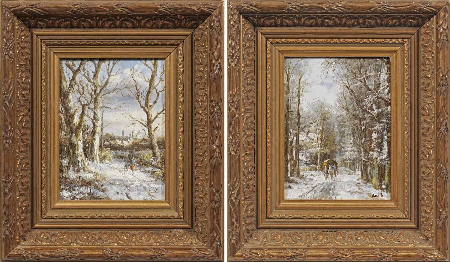 Pair of winter landscapes. Oil on wooden panel. Each signed.
