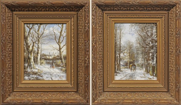 Gegenstücke. Stimmungsvolle, in pastosen Farben impressiv gemalte, die winterlichen Lichtverhältnisse betonende Werke des Utrechter Malers Arend van de Pol. Öl/Holzplatte: Je r. u. sign.; 18 cm x 13,5 cm. Rahmen.
