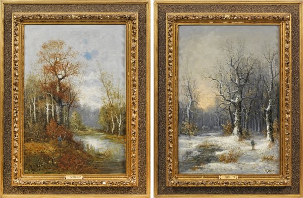 Gegenstücke. Herbstlandschaft und verschneite Winterlandschaft mit Figurenstaffage. In Motiv, Komposition und Stil für Kaufmann charakteristische Landschaften, der seine Werke häufig unter verschiedensten Pseudonymen signierte. Öl/Lwd.; L. u. bzw. r. u. sign. unter dem Pseudonym "R. Meriot" ; Rücks. alte Klebezettel mit Bez. "Eigentum d. Herrn Grafen Lazsky". 69 cm x 47 cm. Original-Rahmen.