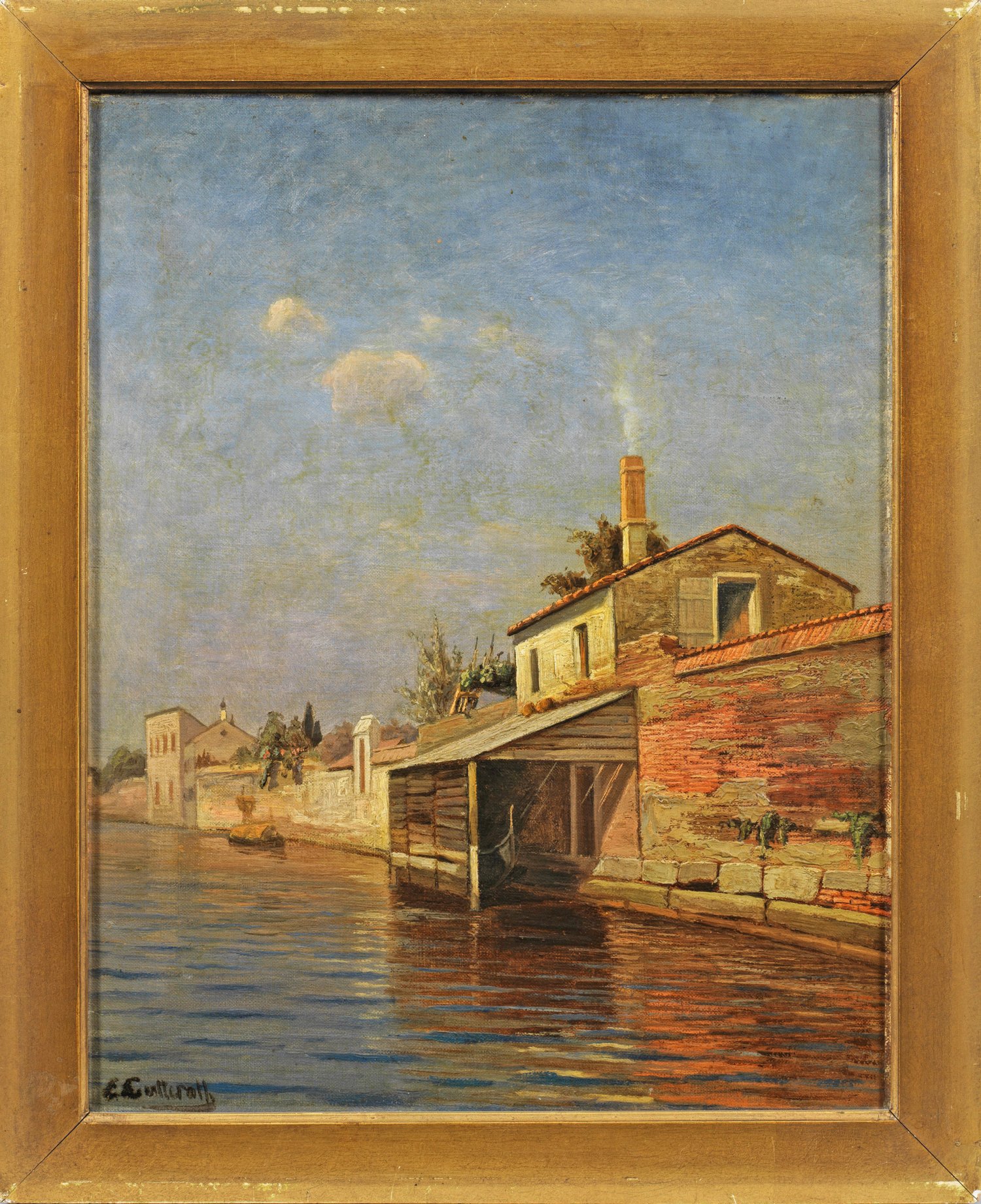 Stimmungsvolle, in warmes mediterranes Licht getauchte Impression Lutteroths, die in Hamburg, Karlsruhe und München ausgebildet wurde und mit Vorliebe Küstenmotive aus Norwegen, den Lofoten und italienischer Lagunen malte. Öl/Lwd., kaschiert auf Karton. L. u. sign.; 37,7 cm x 30,2 cm. Rahmen.