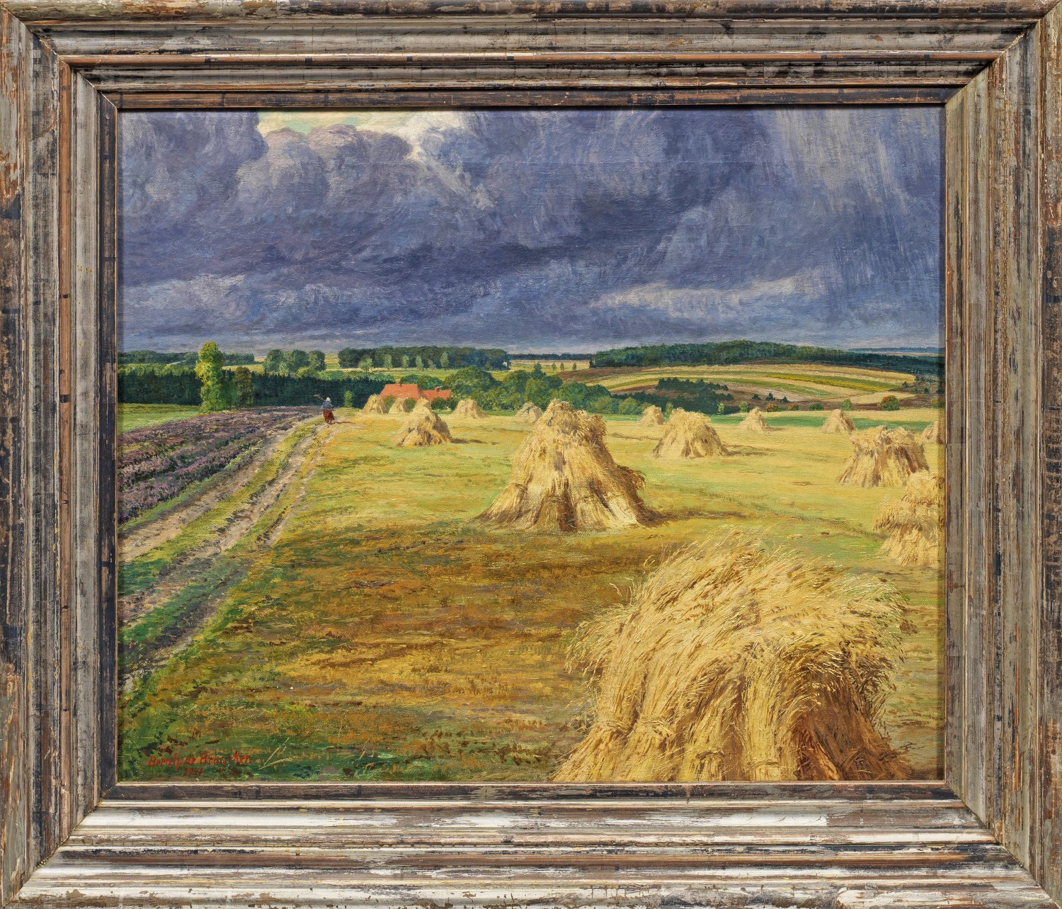 Norddeutsche Stimmungslandschaft mit Getreidehocken bei Undeloh in der Lüneburger Heide, im Mittelgrund eine vor einem dräuenden Unwetter heimwärts ziehende Bäuerin. Öl/Lwd.; L. u. sign. u. dat. 1921. Überdies verso vom Künstler bez., dat. 1921 und betitelt mit Ortsangabe Undeloh. 48 cm x 49,5 cm. Rahmen.