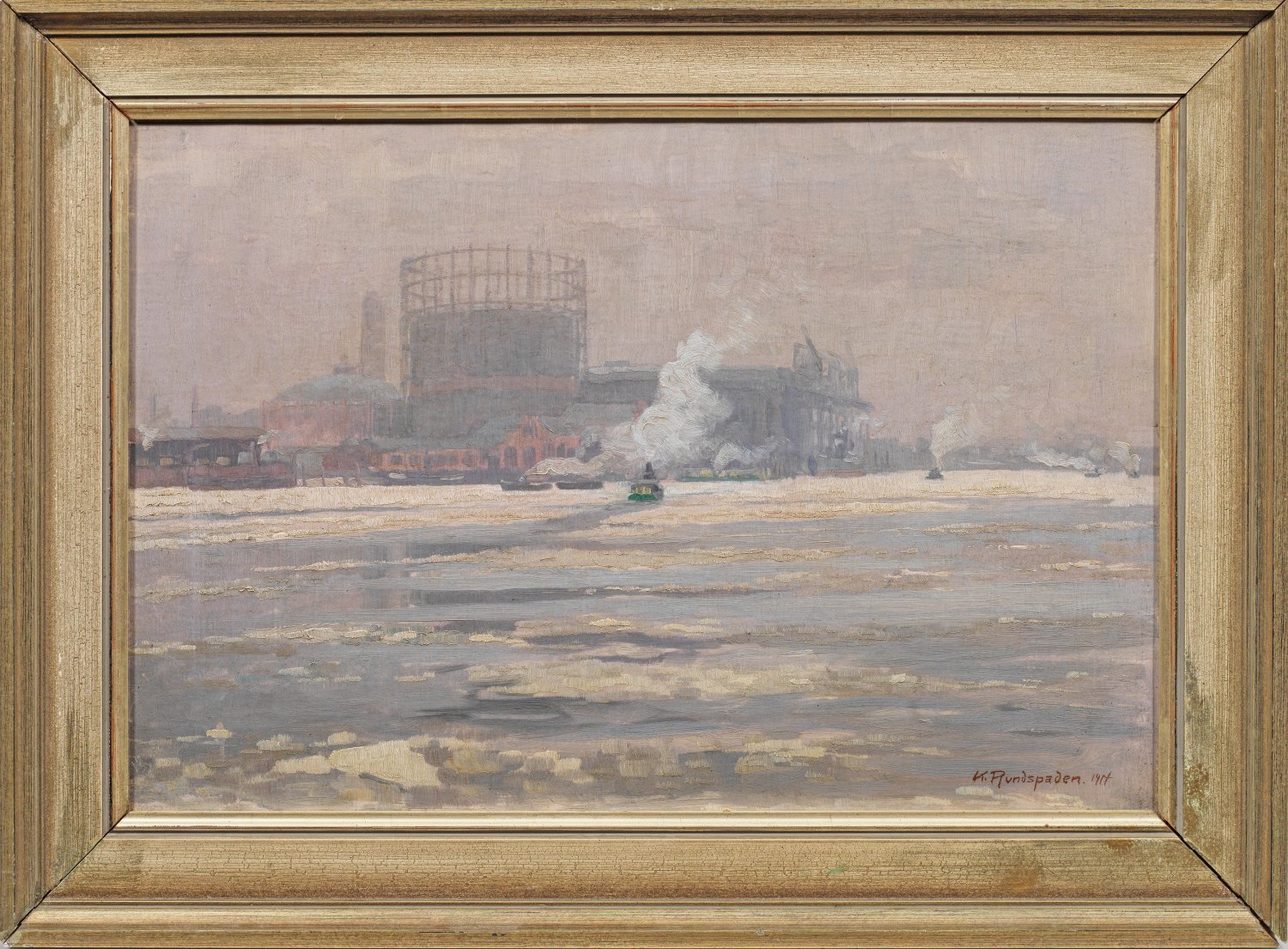 Stimmungsvolle, in pasteltonigem Kolorit gemalte, teils vereiste Elbansicht im Hamburger Hafen mit Blick auf den alten Gasometer Grasbrook. Rundspaden studierte an der Kunstgewerbeschule in München und unternahm Studienreisen nach Tirol, Italien und Norwegen. Öl/Lwd.; R. u. sign. u. dat. 1914. Verso auf Atelieretikett bez. und betitelt. Etikett der Galerie Alfred Lochte, Hamburg. 44 cm x 65 cm. Rahmen.