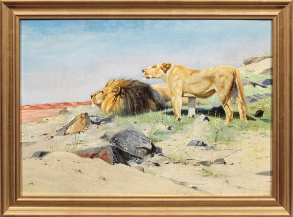 In hellem, warmen Kolorit und weichem Duktus gemalte Tierdarstellung nach dem von Wilhelm Kuhnert im Frühling 1905 - während der Vorbereitungen zu seiner zweiten Ostafrika-Expedition - geschaffenen Gemälde, das auch als "Beute spähende Löwen" und "Löwenpaar auf der Lauer" betitelt wurde. Öl/Lwd., doubliert. Verso mit gestempeltem Künstlerhinweis und Nummerierung. 60 cm x 85,5 cm. Rahmen.