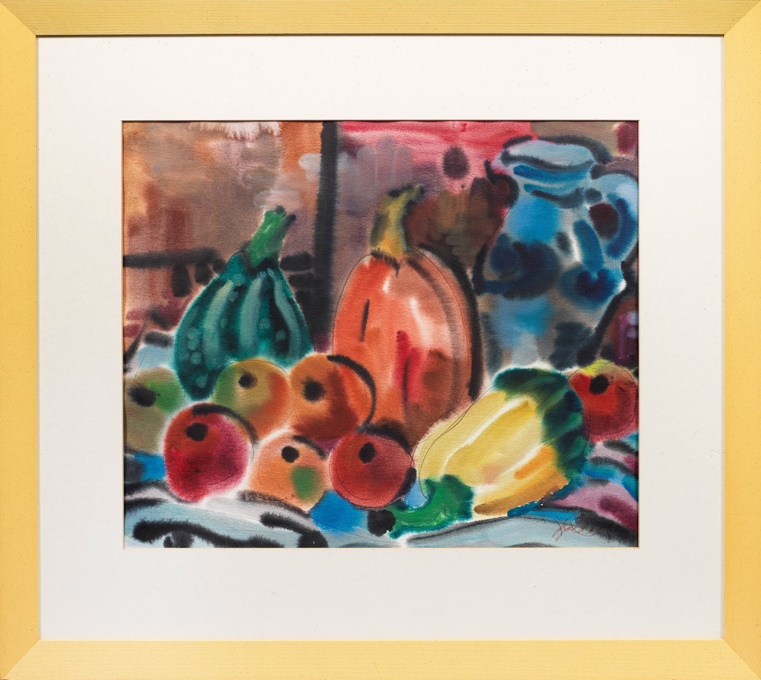 Expressionistisches, farbenfrohes Blatt Bredows, der zum Freundes- und Bekanntenkreis Max Kaus', Erich Heckels und Karl Schmidt-Rottluffs gehörte und als Künstler der Klassischen Moderne zur sog. verschollenen Generation zählt. Aquarell/Bütten. R. u. sign. und dat. (19)63. Passepartoutausschnitt 48 cm x 58,5 cm. Rahmen.