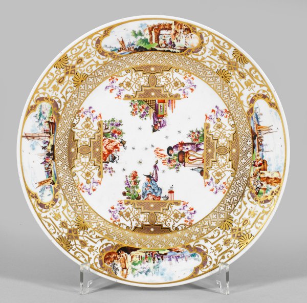 Runde Form mit glattem Rand. Im leicht vertieften Spiegel vier szenische Chinoiserie-Darstellungen von festlich gekleideten Chinesen in blühender Gartenlandschaft bei der Teezeremonie, komponiert auf hohen, schwarz konturierten Gitterwerk-Konsolen, reich umzogen von Laub- und Bandelwerk. Auf der Fahne goldkonturierte Vierpassreserven, darin Landschafts- und Kauffahrteiszenen. Spätere polychrome Malerei des Hausmalers Weisse, um 1900 (Vgl. Gielke, Kat. Grassi-Museum, S. 164). Reicher Golddekor aus arabeskem Bandelwerk, Mosaikbordüre mit Lüsterfondflächen. Dreherzeichen. Minim. rest.; Schwertermarke. D. 27 cm.