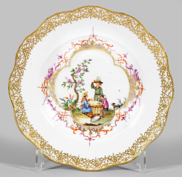Runde Form mit wellenartig geschweiftem Rand. Im vertieften Spiegel vierpassige Laub- und Bandelwerkreserve mit Lüsterfond. Darin szenische Darstellung einer chinesischen Familie bei der Teezeremonie in blühender Gartenlandschaft in polychromer Malerei. Breite Goldspitzenbordüre. Minim. rest.; Schwertermarke. D. 23 cm.