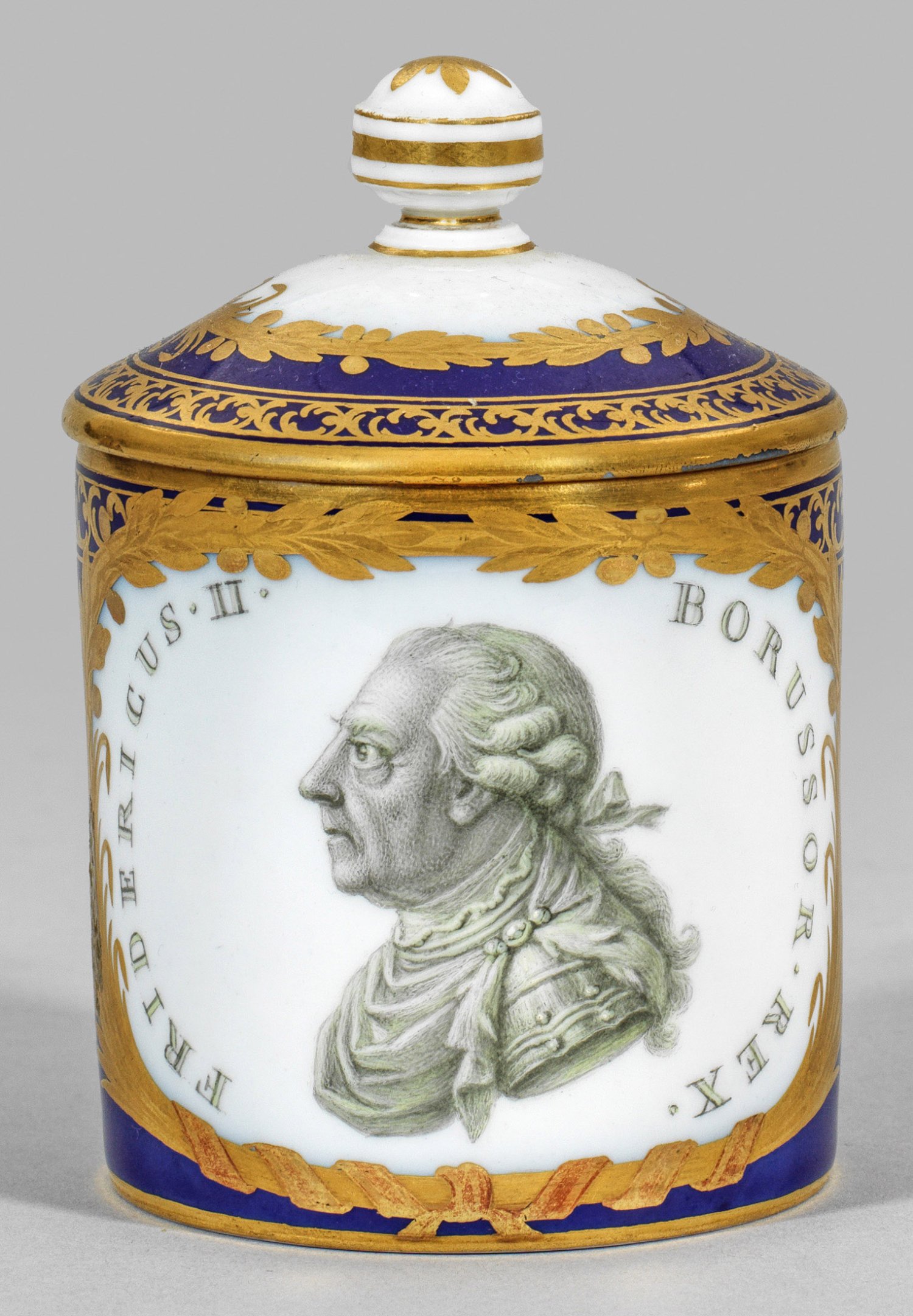 Zylinderförmiger Korpus mit Henkel "à la grecque". Leicht gewölbter Deckel mit Balusterknauf. Form "Antiqueglatt". Kobaltblauer Fond. Schauseitig, von radierten Goldranken umzogene Reserve mit Porträt von Friedrich II., König von Preußen, genannt Friedrich der Große mit Umschrift ''FRIDERICUS.II.BORUSSOR. REX.'' in gelblich akzentuierter Grisaillemalerei. Umlaufende Rankenbordüre. Minim. ber./rest.; Zeptermarke. H. 10,5 cm.