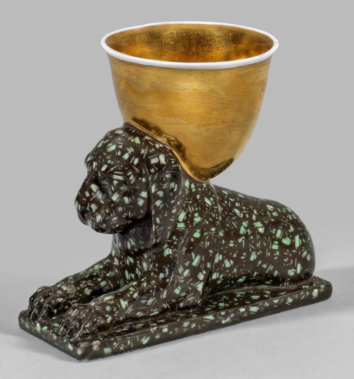 Rechteckige Plinthe mit liegendem Panther als Träger für den Eierbecher. Ovoider Korpus mit leicht ausgestelltem Rand. Farbiger Dekor als Imitation von grünem Porphyr in polychromer Malerei. Innen- und Außenvergoldung. Zeptermarke. H. 8 cm.
