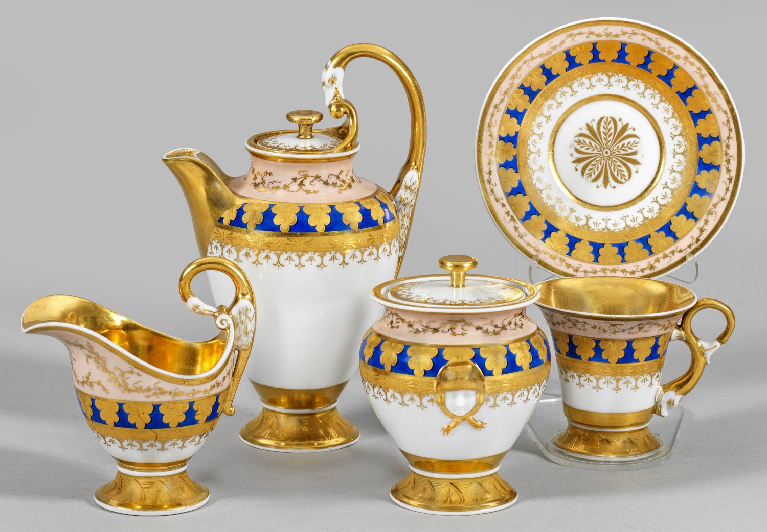 4-tlg.; Kaffeekanne, Zuckerdose, Sahnegießer, Kaffeetasse mit Untertasse. Kalathos- bzw. etrurische Form mit geschweiftem Henkel als Delphin, Schwanenhals bzw. Maskaronköpfe. Auf der Wandung und im Spiegel stilisierter, teilw. radierter Golddekor aus verschiedenen Blatt- und Ornamentbordüren auf weißem, königsblauen und roséfarbenen Fonds. Innenvergoldung. Malerzeichen I in Schwarz. Teilw. minim. rest.; Zeptermarke. Kannen-H. 19,5 cm. Tassen-H. 8 cm.