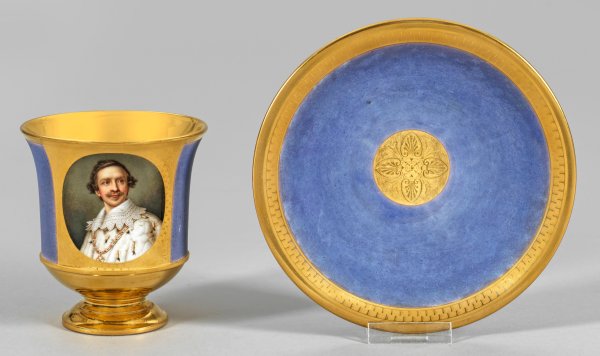 auf Untertasse. Glockenform auf getrepptem Rundfuß. Seitlich volutierter Ohrenhenkel. Fliederfarbener Mattfond. Schauseitig, in goldradierter Ornamentrahmung, das Ovalbildnis von König Ludwig I. von Bayern im Krönungsornat nach einem Gemälde von Joseph Stieler (1826) in äußerst feiner, polychromer Malerei. Außen- und Innenvergoldung. Eingepresste Manufakturmarke. H. 10 cm.