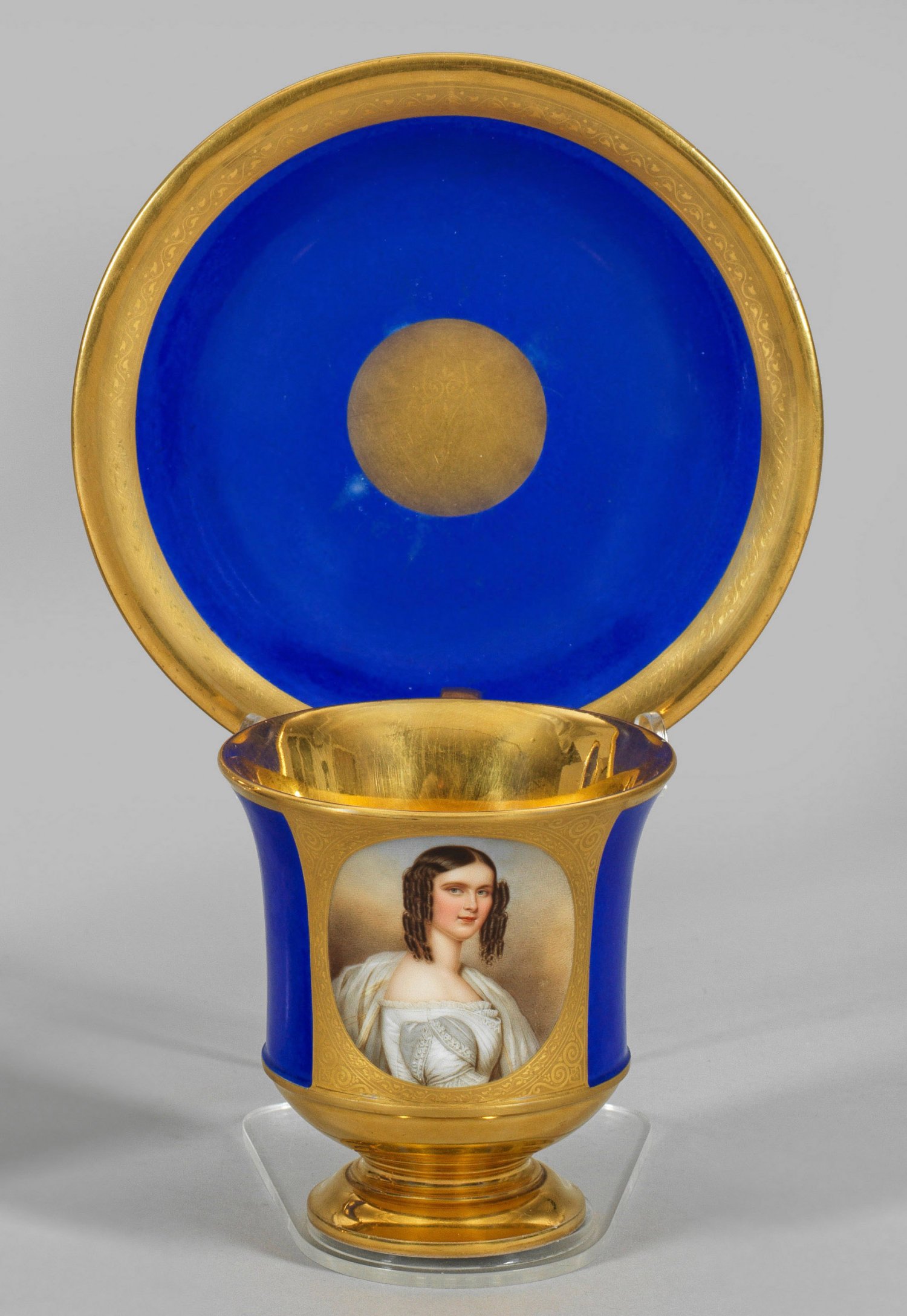 auf Untertasse. Glockenform auf getrepptem Rundfuß. Seitlicher Ohrenhenkel. Königsblauer Fond. Schauseitig, in goldradierter Ornamentrahmung, das Ovalbildnis von Hildegard Luise Prinzessin von Bayern als Braut nach Joseph Stieler (1844) in äußerst feiner, polychromer Malerei. Außen- und Innenvergoldung. Eingepresste Manufakturmarke. H. 9,5 cm.