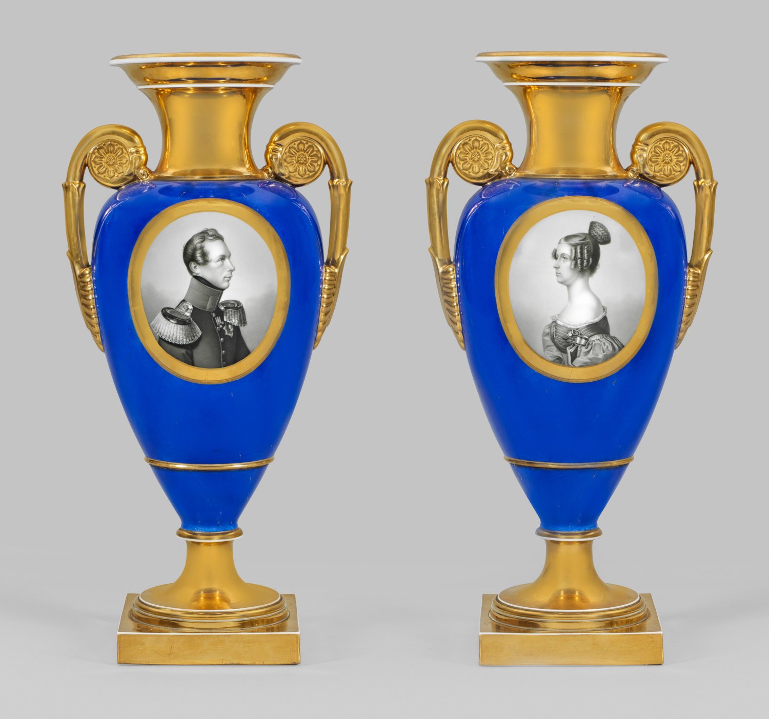 Über quadratischer Plinthe mit hochgezogenem Rundfuß, amphorenförmiger Korpus mit gerundeter Schulter, abgesetztem, eingezogenen Hals und weit ausschwingender, profilierter Randzone. Seitlich angesetzte, aus Palmettenreliefs aufsteigende, eingerollte Rosettenhenkel. Königsblauer Fond mit gesprenkelten Goldakzenten. Beidseitig der Wandung ausgesparte, von breitem Goldrand umzogene Medaillonreserve. Darin das Brustbildnis von Friedrich Wilhelm IV. als Kronprinz (1795 - 1861) in Uniform mit Bruststern (Schwarzer Adlerorden) und Eisernem Kreuz bzw. seiner Gattin Elisabeth Luise von Bayern (1801 - 1873), älteste Tochter von König Maximilian I. Joseph von Bayern, in äußerst feiner Grisaille-Malerei. Reiche Vergoldung. Form-Entw. Karl Friedrich Schinkel, um 1820 - 1830. Malerzeichen. Minim. rest.; Zepter- und Malereimarke. H. 48 cm.