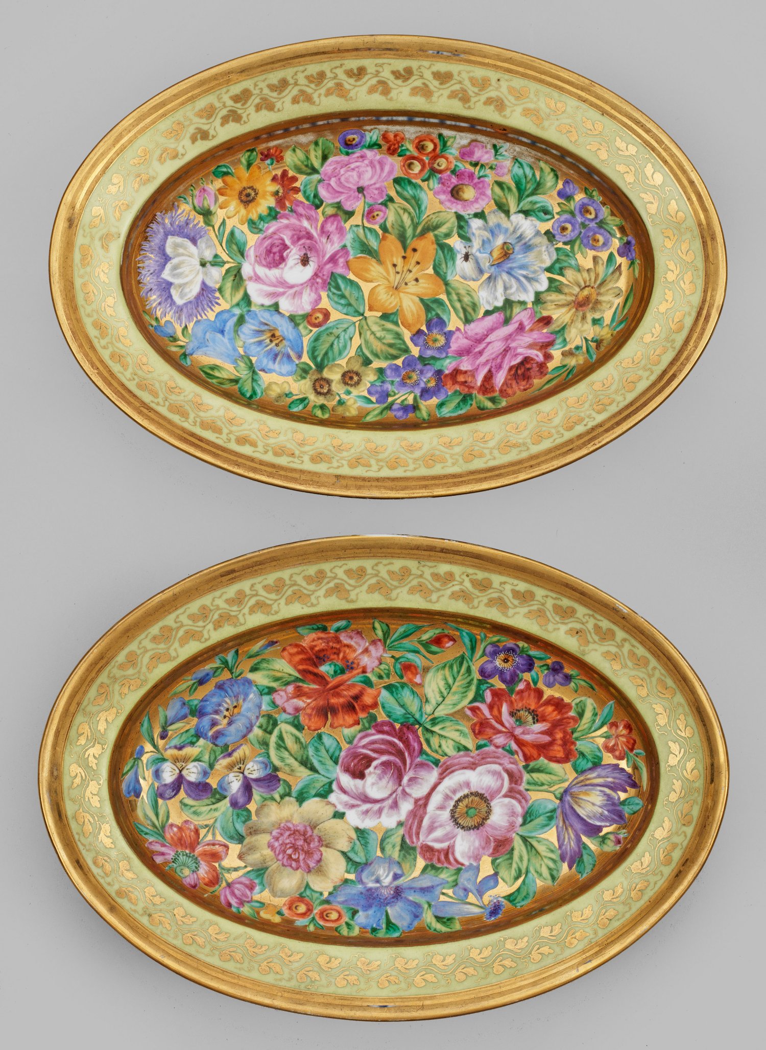 Ovale, gemuldete Form. Breite, schräg ansteigende Fahne mit umlaufender, goldener Weinlaubbordüre auf limonengrünem Fond. Im Spiegel flächendeckender, farbenprächtiger Blumendekor in polychromer Malerei auf Goldfond. Altersbedingt ber.; Eingepresste Manufakturmarke mit Dat. (1)843. 33 cm x 23 cm.
