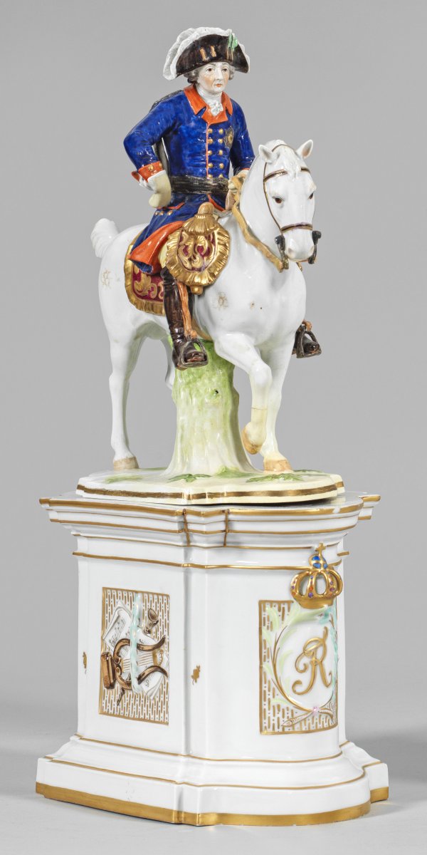 auf architektonischem Profilsockel mit Trophäenreliefs und frontseitigem, bekröntem Monogramm FR (Fridericus Rex). Zu Pferd sitzender Friedrich II. von Preußen, genannt "Alter Fritz" in königsblauer Uniform mit Dreispitz und Schwarzem Adler-Orden. Polychrome Malerei mit Goldstaffage. Entw. Carl Gottlieb Schubert. Teilw. sichtbar rest./rep.; Manufakturmarke. Ges.-H. 50 cm. Figuren-H. 30 cm.