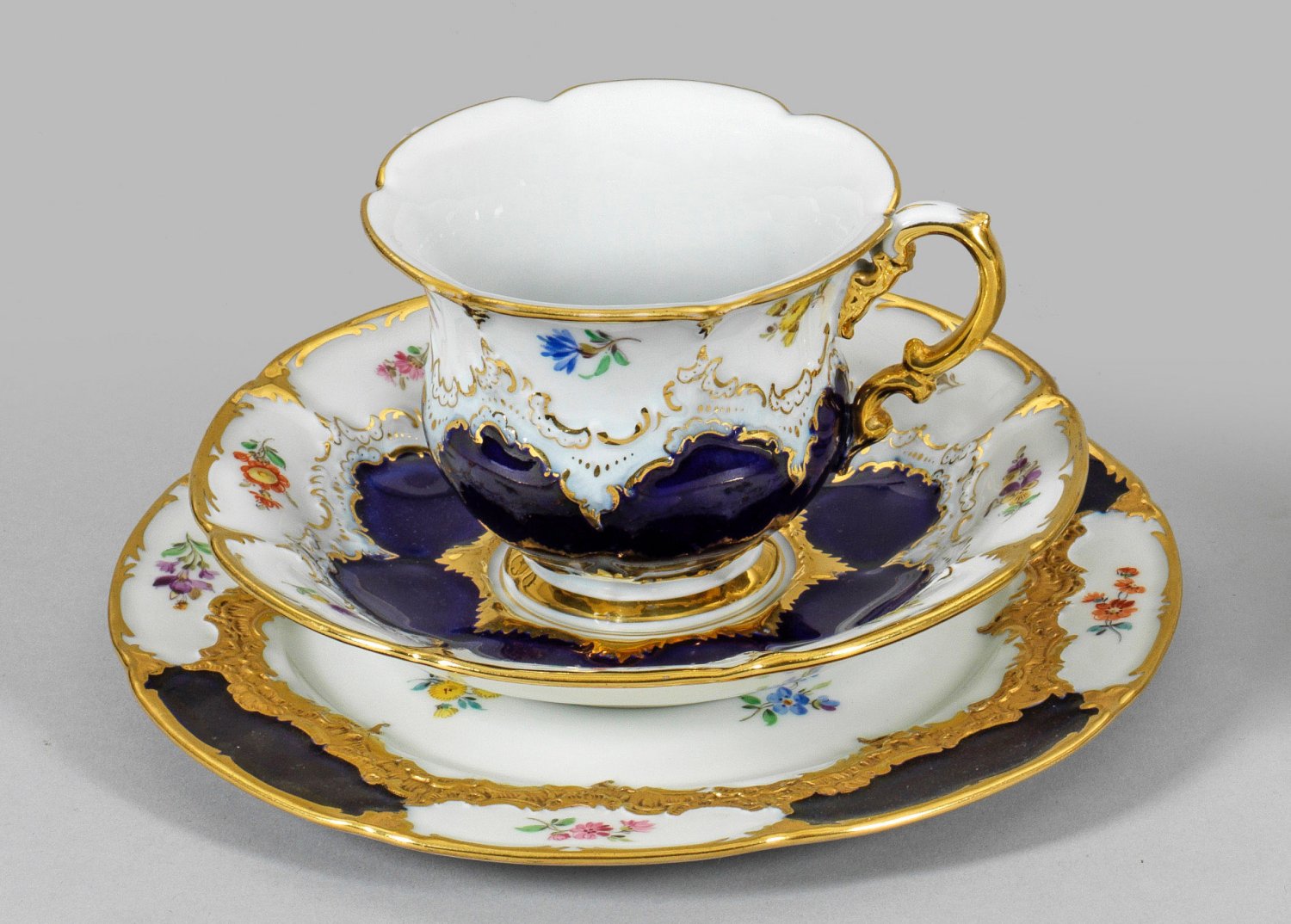 2-tlg.; Kuchenteller, Kaffeetasse mit Untertasse. B-Form. Teilw. kobaltblauer Fond. Rocaillerelief sowie feine Streublumenmalerei. Goldstaffage. Ger. abweichender Teller mit sog. Goldbronze. Schwertermarke. Tassen-H. 7,5 cm. D. 9,5 cm - 19 cm.
