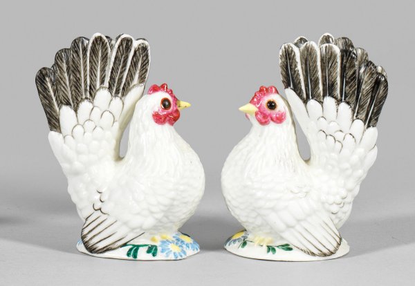 Vollplastische Hennen mit reliefiertem Gefieder auf rundem, blütenreliefiertem Sockel. Polychrome Malerei. Entw. Luise Terletzki-Scherf. Manufakturmarke. H. 10 cm.